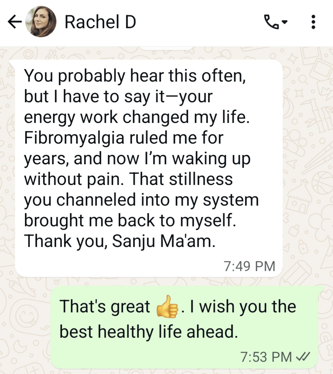 Living with fibromyalgia felt like a slow, invisible breakdown. Guru Sanju’s coaching brought relief where nothing else did. Her method rewired how my body responds to pain and stress. For the first time in years, I feel free, clear, and fully alive.